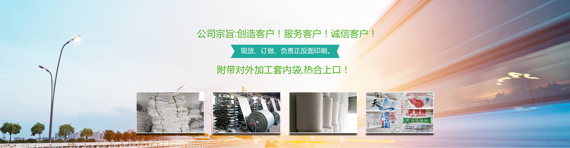 本公司常年生產(chǎn): 編織袋、彩膜、食品袋、集裝袋、飼料袋、化肥袋、水泥袋、化工袋、普危包裝袋、坯布專用內(nèi)袋、包皮、印染廠整裝專用包裝、有現(xiàn)貨、也訂做、負(fù)責(zé)正反面印刷。附帶對外加工套內(nèi)袋,熱合上口!聯(lián)系人:王經(jīng)理。 公司宗旨:創(chuàng)造客戶!服務(wù)客戶!誠信客戶! 13256289338.17686389888